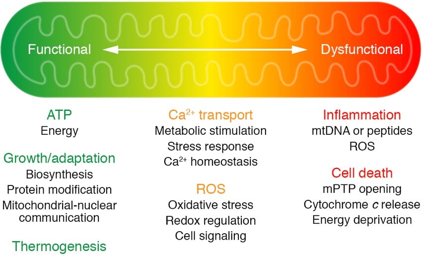 “An overview of mitochondrial function in health and disease. Mitochondria are known as the powerhouse of the cell. Under normal conditions, oxidative metabolism in mitochondria produces ATP; it also produces heat in certain specialized cell types, such as brown adipocytes. In addition to generating ATP, intermediate metabolism in the mitochondria produces metabolites for biosynthesis, protein modification, and signal transduction. Oxidative phosphorylation is coupled with generation of reactive oxygen species (ROS), which can either serve as molecular signals or cause cell damage and cell death. Mitochondrial metabolism is stimulated by calcium, but under pathological conditions, calcium overload can trigger the opening of the mitochondrial permeability transition pore (mPTP). The release of mitochondrial content, such as cytochrome c, induces apoptosis, or the loss of membrane potential (a consequence of prolonged mPTP opening) causes ATP deprivation and necrosis. Leak of damage-associated molecular patterns (DAMPs), such as mitochondrial DNA and peptides, or excessive ROS generation also causes inflammation that results in further tissue damage. The transition of mitochondria from a powerhouse to a death engine is key to the pathogenesis of many diseases, including heart failure (also see Figure 3).”