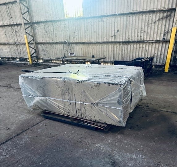 The picture below shows a 2000-lb compressed bale of SGP+™ after formulation and processing, whereby steaming hot bagasse at roughly 145 degrees F is transformed into SGP+™ in less than 2-minutes into a bale cooled to roughly 94 degrees F (and continues to cool to roughly 84 degrees F) in a cost-effective, ecofriendly manner.