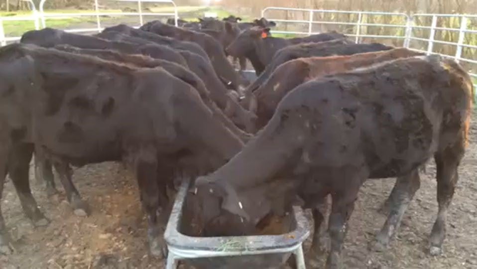 The picture below illustrates newly acquired F-1 Brangus Heifers being introduced to SGP+™. In nearly 12 years of SGP+™ use with over 3000 beef /dairy heifers, beef steers, and dairy cows fed SGP+™ as a ration supplement, there are NO reports of a single heifer, calf, or steer harmed.