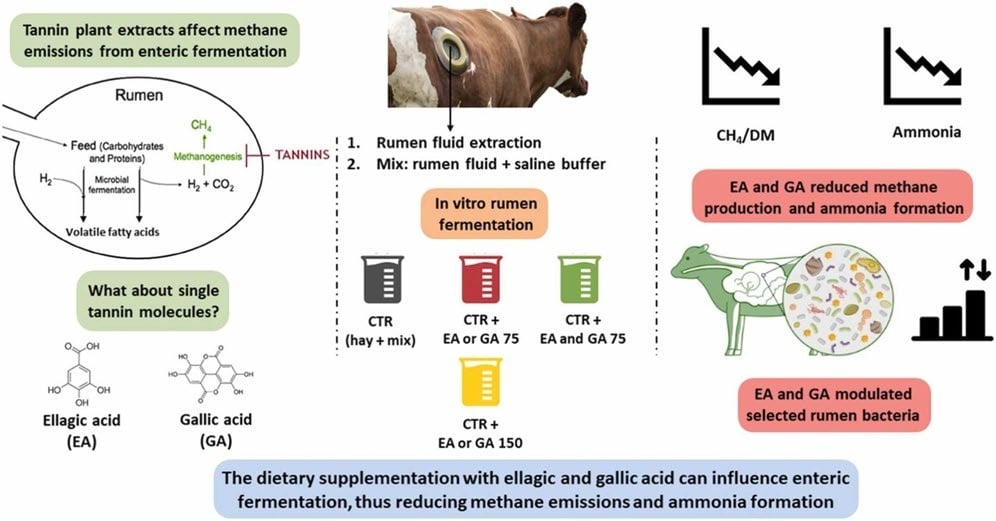- Ellagic and gallic acid decreased methane emissions and ammonia formation.