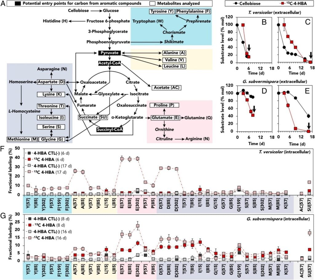 C-labeling experiments demonstrate carbon flux of lignin-derived compounds to central metabolism. (A) Abbreviated map showing central carbon metabolic pathways and amino acid biosynthesis in WRF based on the current KEGG model for T. versicolor. (B–E) Substrate level (molar percent) of extracellular metabolites (cellobiose and 4-HBA) in (B) 6-d and (C) 17-d T. versicolor cultivations and (D) 8-d and (E) 16-d G. subvermispora cultivations. A value of 100% corresponds to the initial concentration (7.5 mM in all cases, excluding cellobiose concentration in the 17-d T. versicolor cultivations, which was 3.75 mM). Arrows indicate the sample collection time for 13C intracellular analysis. (F–G) Fractional labeling in detected proteinogenic amino acid fragments and other metabolites (acetate and succinate) in (F) T. versicolor and (G) G. subvermispora cultivations when providing unlabeled 4-HBA [negative control, CTL(-)] and 13C-ring–labeled 4HBA. Amino acids fragments (i.e., [15], [57], [85], [159], and [302]) are the result of the derivatization and analysis as thoroughly detailed by Nalsen et al. (33).
