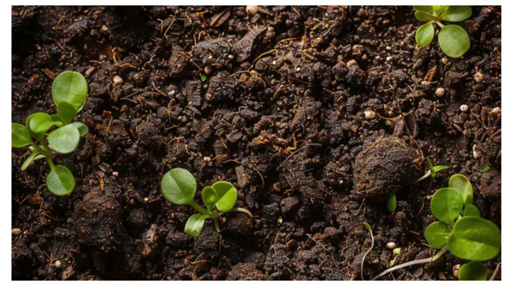 Picture 6: “Close-up view of moist, dark humus soil with tiny green seedlings sprouting, showcasing the early stages of plant growth.”